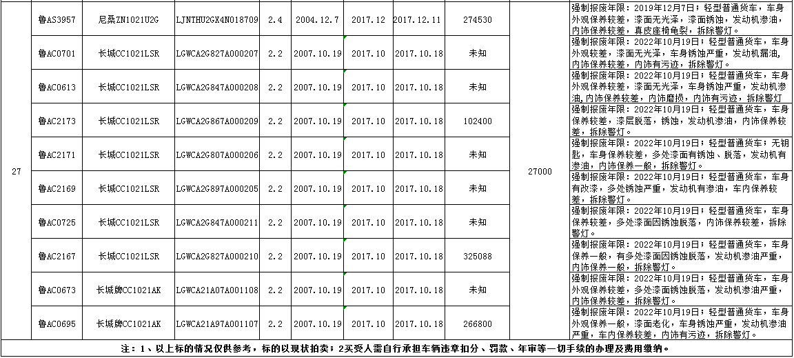 意向競買者請于2017年8月27日16:00之前將拍賣保證金10000元/輛交至以下賬戶(戶名:金諾國際拍賣有限公司,開戶行:齊魯銀行濟(jì)南歷城支行,賬號:000000726003800003937),準(zhǔn)備有效身份證明(個人:身份證原件及復(fù)印件;法人:營業(yè)執(zhí)照復(fù)印件)聯(lián)系本公司辦理競買登記。