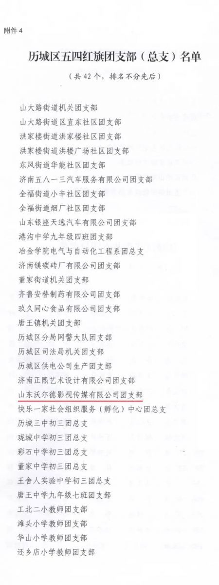 2018年5月11日,共青團(tuán)濟(jì)南市歷城區(qū)十五屆五次全委(擴(kuò)大)會(huì)議勝利召開(kāi),會(huì)上對(duì)2017年度在共青團(tuán)工作方面取得優(yōu)秀成績(jī)的先進(jìn)集體及先進(jìn)個(gè)人進(jìn)行了表彰。沃爾德集團(tuán)團(tuán)委、沃爾德影視公司團(tuán)支部及團(tuán)干部、團(tuán)員、青年志愿者代表榮獲各項(xiàng)榮譽(yù)稱號(hào)。