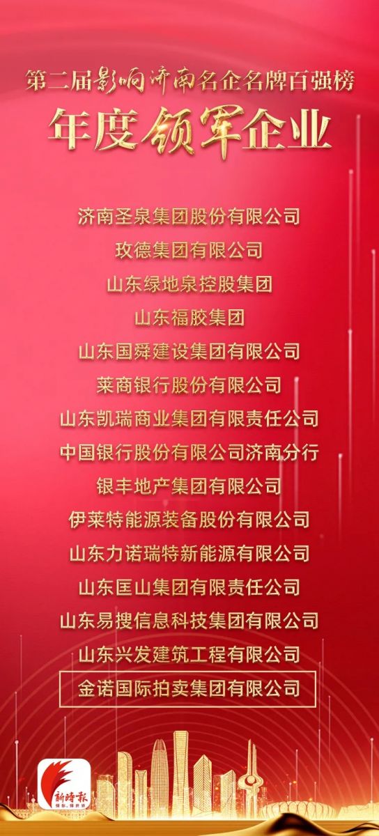 特別榮幸也特別感謝評選組委會的認可,未來金諾國拍集團將不斷創(chuàng)新驅動,提升核心競爭力,發(fā)揚“創(chuàng)新發(fā)展、專業(yè)匠心、追求卓越”的新時代企業(yè)精神,不遺余力打造“中國著名拍賣集團企業(yè)”,為強省會高質量發(fā)展做出新的貢獻!