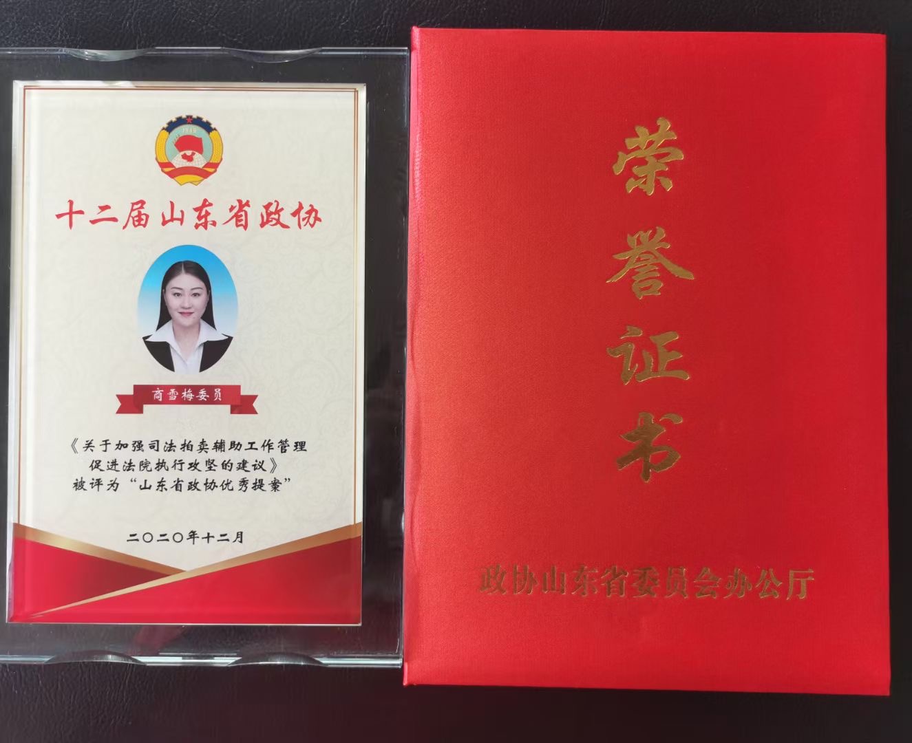 會議表彰了十二屆省政協(xié)以來的優(yōu)秀提案、先進(jìn)提案承辦單位和先進(jìn)提案工作者。山東省政協(xié)委員、山東省新的社會階層人士聯(lián)誼會副會長、金諾國拍集團(tuán)董事長商雪梅撰寫的《關(guān)于加強(qiáng)司法拍賣輔助工作管理促進(jìn)法院執(zhí)行攻堅的建議》被評為“山東省政協(xié)優(yōu)秀提案”,并在大會上作為唯一一位優(yōu)秀提案代表進(jìn)行了題為《情系建言路 廖力著文章》的匯報發(fā)言。