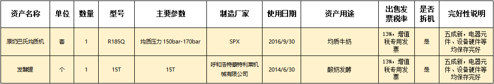 標(biāo)的一:原奶巴氏均質(zhì)機(jī)、發(fā)酵罐,起拍價(jià)格:9萬(wàn)元(含稅,稅率見詳情表),標(biāo)的設(shè)有保留價(jià)。