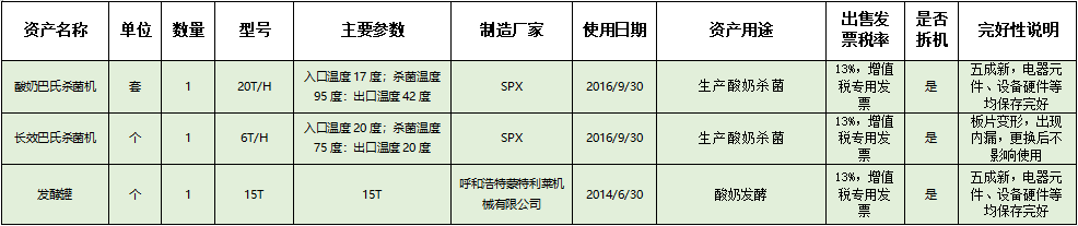 標(biāo)的二:酸奶巴氏殺菌機(jī)、長(zhǎng)效巴氏殺菌機(jī)、發(fā)酵罐,起拍價(jià)格:14萬(wàn)元(含稅,稅率見詳情表),標(biāo)的設(shè)有保留價(jià)。