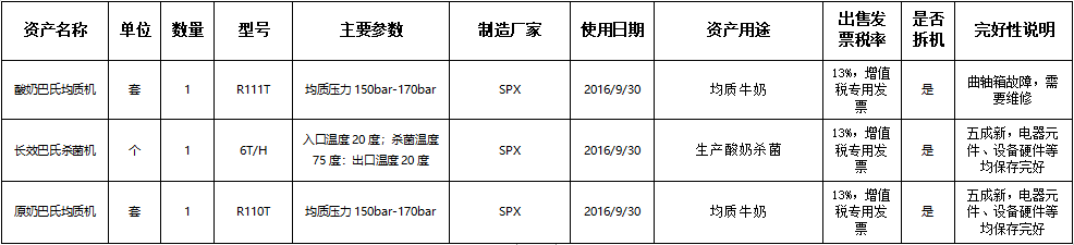 標(biāo)的三:酸奶巴氏均質(zhì)機(jī)、長(zhǎng)效巴氏殺菌機(jī)、原奶巴氏均質(zhì)機(jī),起拍價(jià)格:15萬(wàn)元(含稅,稅率見詳情表),標(biāo)的設(shè)有保留價(jià)。