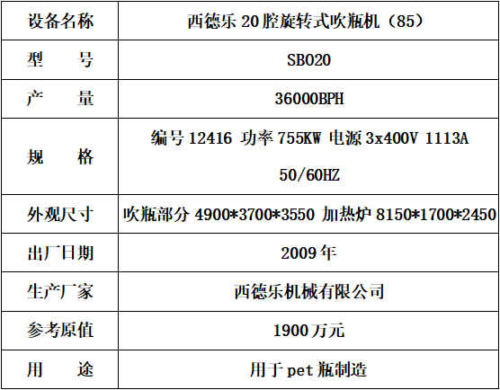 標(biāo)的一:西德樂20腔旋轉(zhuǎn)式吹瓶機(jī),起拍價(jià) 160萬(wàn)元(不含稅),標(biāo)的設(shè)有保留價(jià),競(jìng)買保證金15萬(wàn)元。已拆機(jī),設(shè)備完好。