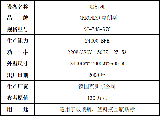 標(biāo)的三:貼標(biāo)機(jī),起拍價(jià) 15萬(wàn)元(不含稅),標(biāo)的設(shè)有保留價(jià),競(jìng)買保證金3萬(wàn)元。已拆機(jī),設(shè)備完好。