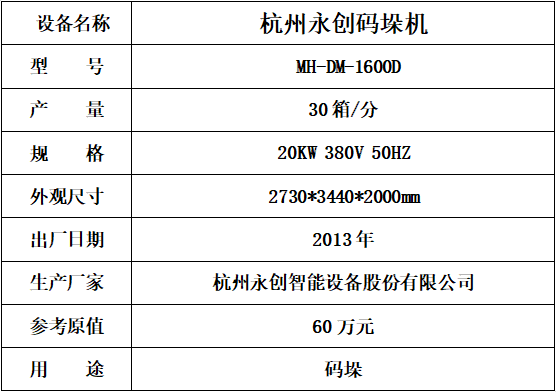 標(biāo)的六:永創(chuàng)碼垛機(jī),起拍價(jià):15萬(wàn)元(不含稅),標(biāo)的設(shè)有保留價(jià),競(jìng)買保證金3萬(wàn)元。已拆機(jī),設(shè)備完好。