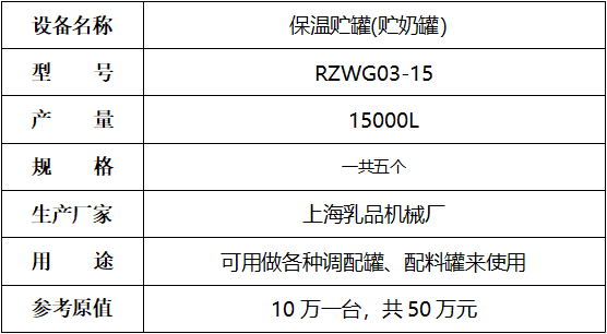 標(biāo)的七:上海乳品廠5個(gè)儲(chǔ)奶罐,起拍價(jià):40萬(wàn)元(不含稅),標(biāo)的設(shè)有保留價(jià),競(jìng)買保證金8萬(wàn)元。已拆機(jī),設(shè)備完好。
