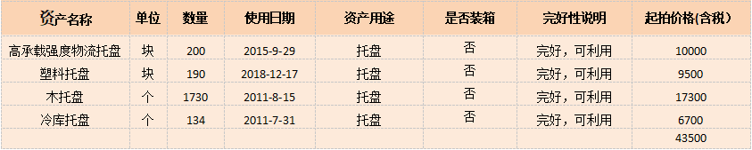 受委托,我公司將于2022年3月16日下午15時(shí)在金拍網(wǎng)平臺(tái)https://www.jinpaiwang.com.cn以網(wǎng)絡(luò)競(jìng)價(jià)的方式公開處置高承載強(qiáng)度物流托盤、塑料托盤、木托盤、冷庫托盤等 (具體見標(biāo)的詳情表)。