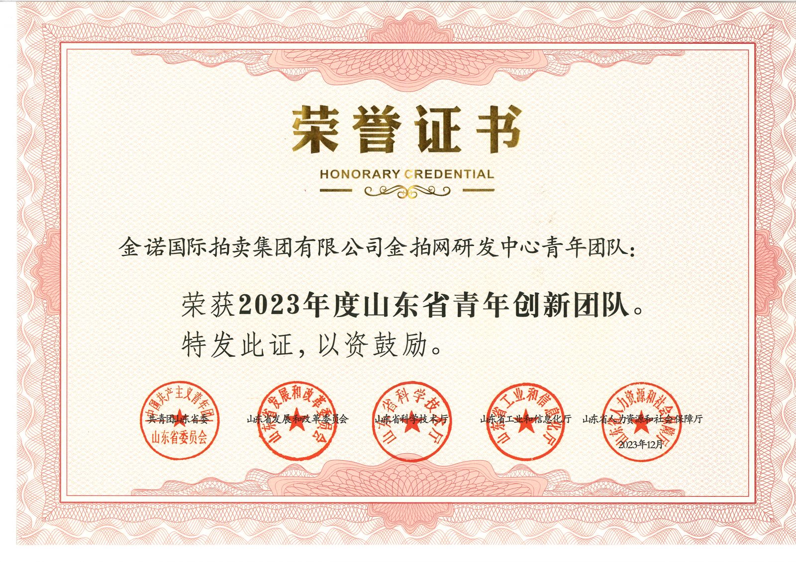 為全面貫徹落實(shí)黨的二十大精神,深刻領(lǐng)會習(xí)近平總書記關(guān)于青年工作的重要思想,在全省廣大青年中營造敢為人先、勇于創(chuàng)新的濃厚氛圍,團(tuán)省委、省發(fā)改委、省科技廳、省工信廳、省人社廳聯(lián)合實(shí)施了“菁才強(qiáng)魯”行動。經(jīng)廣泛推選和嚴(yán)格評審,“金諾國際拍賣集團(tuán)有限公司金拍網(wǎng)研發(fā)中心青年團(tuán)隊(duì)”脫穎而出,榮獲“2023年度山東省青年創(chuàng)新團(tuán)隊(duì)”榮譽(yù)稱號。