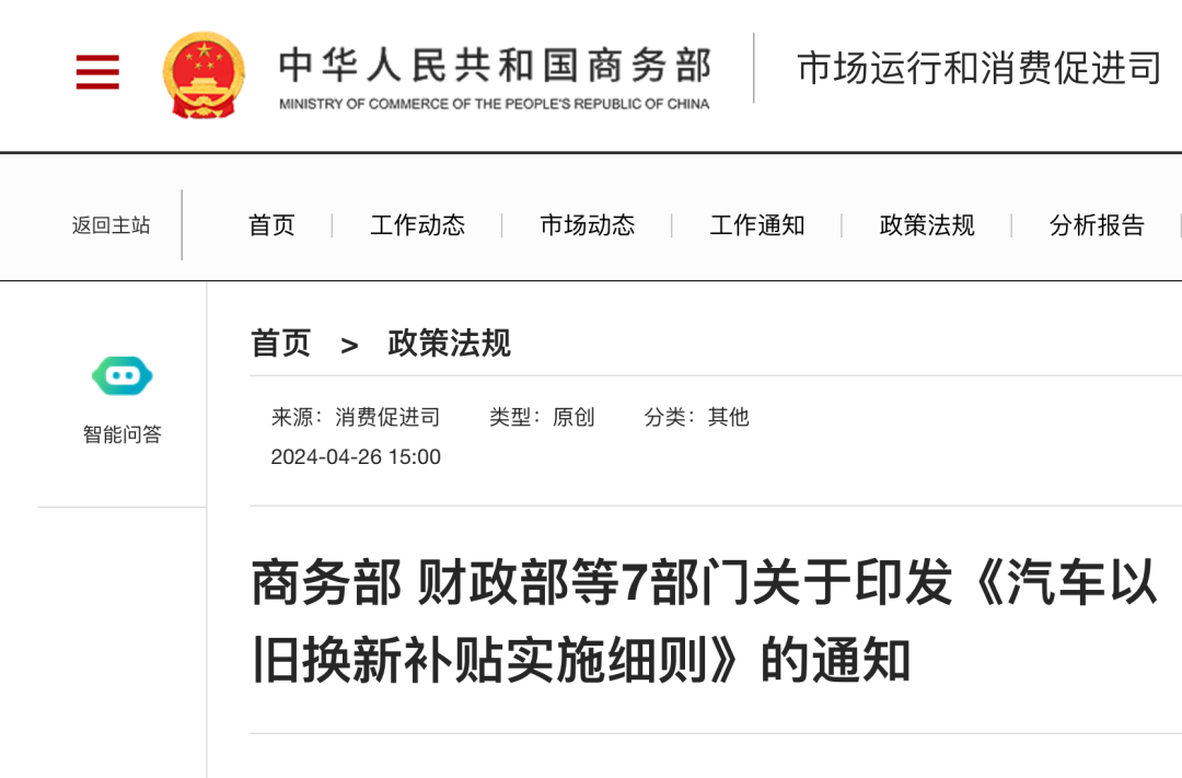 為貫徹落實《國務(wù)院關(guān)于印發(fā)〈推動大規(guī)模設(shè)備更新和消費品以舊換新行動方案〉的通知》(國發(fā)〔2024〕7號)精神,按照《商務(wù)部等14部門關(guān)于印發(fā)〈推動消費品以舊換新行動方案〉的通知》(商消費發(fā)〔2024〕58號)要求,更好實施汽車以舊換新補貼政策,現(xiàn)將《汽車以舊換新補貼實施細則》印發(fā)給你們,請貫徹執(zhí)行。