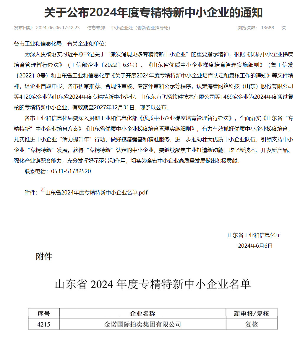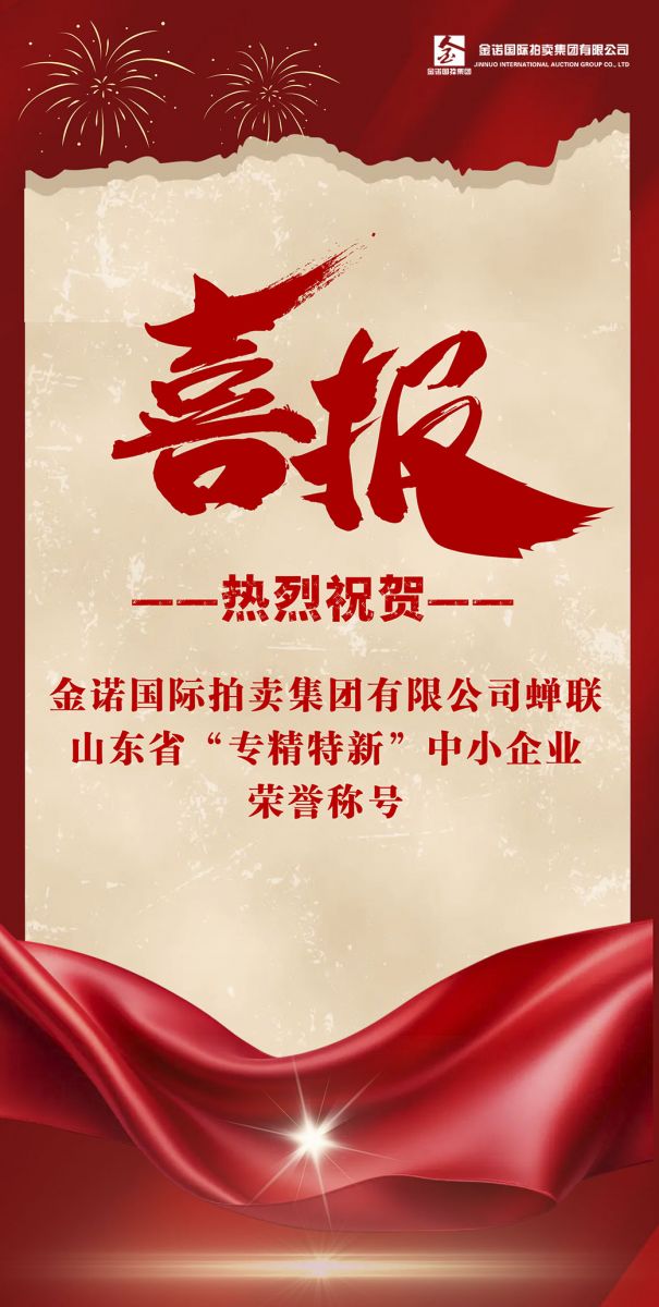 近日,山東省工業(yè)和信息化廳公布了“山東省2024年度專精特新中小企業(yè)名單”,金諾國際拍賣集團有限公司順利通過初審?fù)扑]、合規(guī)性審查和專家評審等程序,蟬聯(lián)山東省“專精特新”中小企業(yè)榮譽稱號。