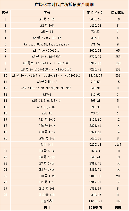 基本情況:該抵債資產(chǎn)位于東營市廣饒縣廣饒濰高路888號(hào)億豐國際時(shí)代廣場,廣饒老汽車站西鄰??偨ㄖ娣e66495.71㎡,房間1558套,經(jīng)法院裁定抵債,未辦理過戶手續(xù)。